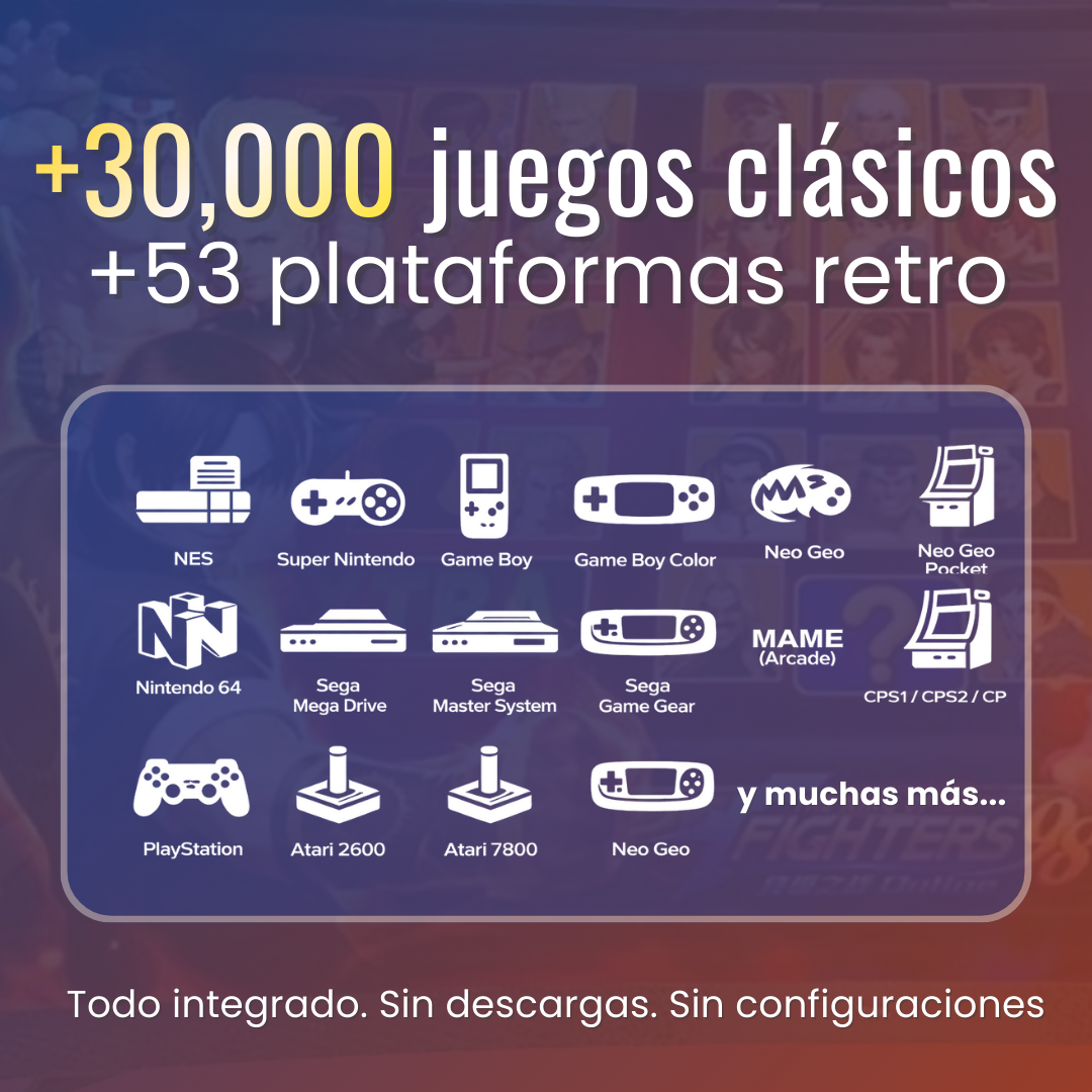 Desconecta del estrés y vuelve a los 90. +30.000 juegos y 50 consolas listos en tu salón. Sin configuraciones ni esperas: solo tú, el mando y ese nivel que se te resistía. Tu infancia empieza de nuevo hoy.